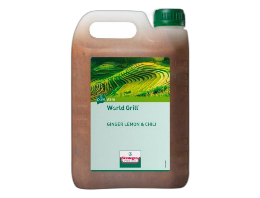 Oranjebruine oliemarinade met een fris pittig karakter en een tekening van rode paprikastukjes, zwarte peper en peterselie. Smaakmakers zijn gember, citroen en chillies.