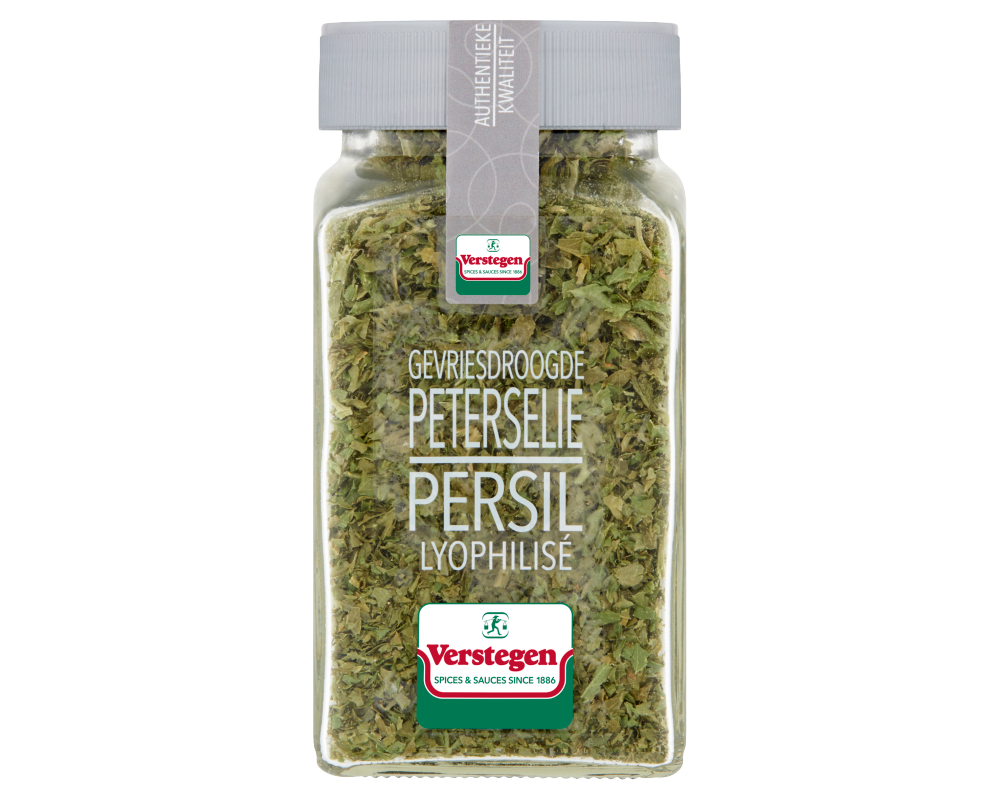 Peterselie is een smaakvol en fris kruid. Om deze frisheid te behouden kun je peterselie het beste pas na de bereiding toevoegen. Lekker in dressings, sauzen, salades en kruidenboter. Daarnaast wordt peterselie ook veel gebruikt als garnering. De peterselie van Verstegen is gevriesdroogd, wat kwalitatief de beste manier is om kruiden te drogen. De smaak blijft zo het beste bewaard. Wanneer de kruiden in aanraking komen met vocht komt de smaak van verse kruiden weer naar boven.
