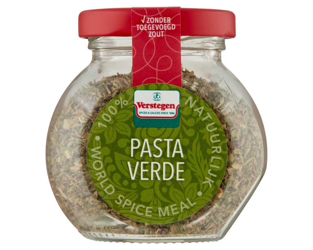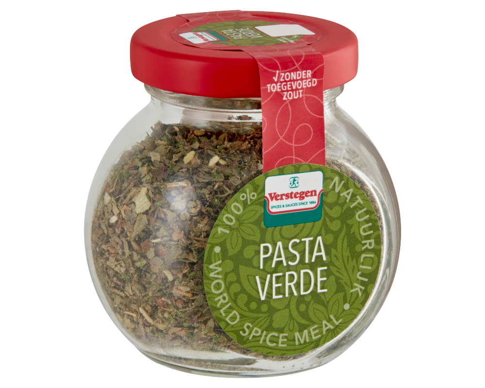 Vier Italië met deze smaakvolle mix voor Pasta Verde (‘groene pasta’). Basilicum en bonenkruid in combinatie met kaas zorgen voor een mooie balans in deze maaltijdmix. Hiermee zet jij in een handomdraai dit heerlijke gerecht op tafel! De World Spice Meal - Pasta Verde zit verpakt ineen handig voorraadpotje en bevat geen toegevoegd zout.