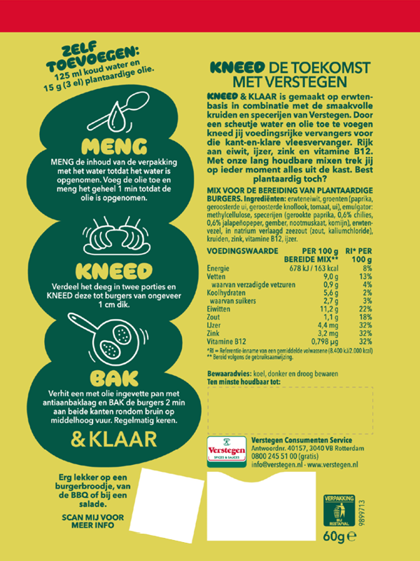Kneed & Klaar is een 100% plantaardige mix gemaakt op erwtenbasis in combinatie met de smaakvolle kruiden en specerijen van Verstegen. Door een scheutje water en olie toe te voegen kneed jij je eigen vleesvervangers. Rijk aan eiwit, ijzer, zink en vitamine B12. De producten van Kneed en Klaar kennen een lange houdbaarheid en korte bereidingstijd. Ze zijn reeds op smaak gebracht, waardoor je alleen nog maar een draai hoeft te geven aan de vorm.