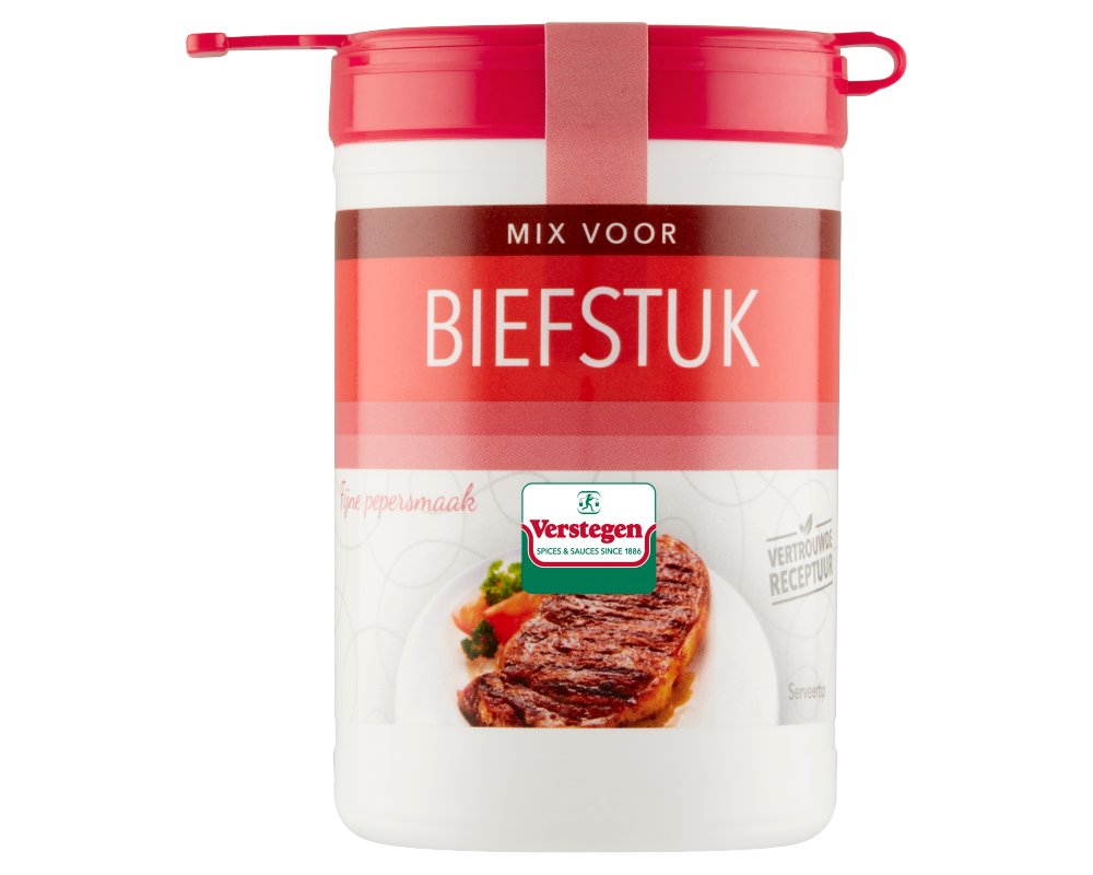 Bereidingswijze (voor 4 personen): wrijf 500 g biefstuk in met ca. 1 el (10 g) Verstegen mix en laat het even intrekken. Verhit 2 el (olijf)olie in een koekenpan, voeg een klontje boter toe en schroei de biefstuk op hoog vuur aan beide kanten dicht. Zet het vuur iets lager en voeg nog een klontje boter toe. Bak het vlees tot de gewenste garing (rosé, medium, doorbakken).