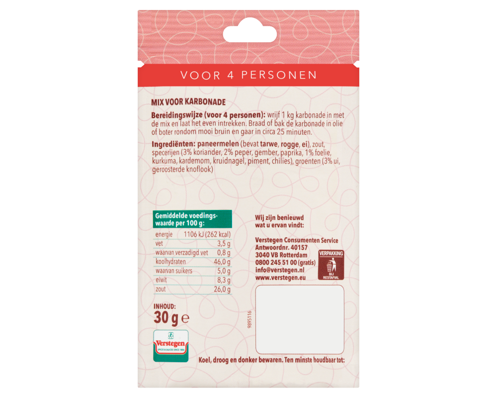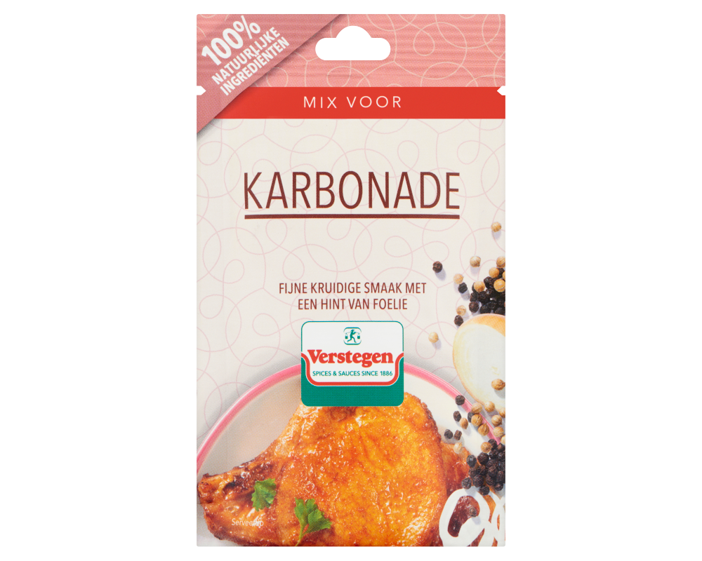 Bereidingswijze (voor 4 personen): wrijf 1 kg karbonade in met de mix en laat het even intrekken. Braad of bak de karbonade in olie of boter rondom mooi bruin en gaar in circa 25 minuten.