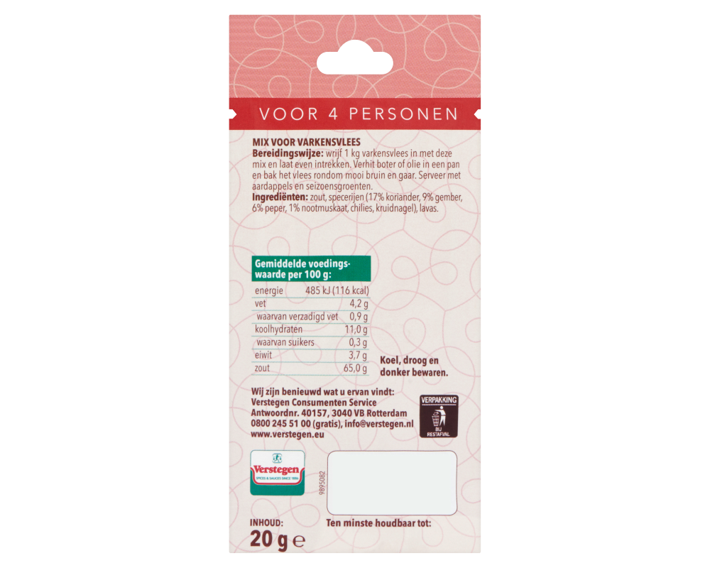 Bereidingswijze: wrijf 1 kg varkensvlees in met deze mix en laat even intrekken. Verhit boter of olie in een pan en bak het vlees rondom mooi bruin en gaar. Serveer met aardappels en seizoensgroenten.